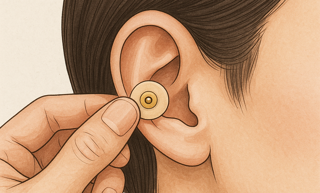 - 耳のツボへの置き鍼という小さなシール状の鍼を貼り、数日間やさしく刺激します
